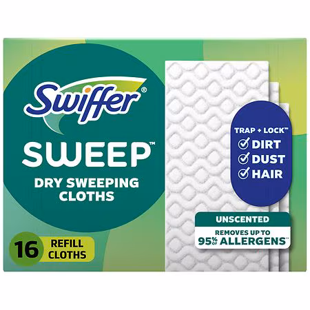 Swiffer Sweep + Mop Multi-Surface Dry Sweeping cloth refills have deep textured ridges that TRAP + LOCK dirt, dust, and hair to keep your floors clean and free of debris. Removes up to 95% of allergens*. Use with your Swiffer Sweep + Mop Device - the convenient combination of a broom and mop for a q...more