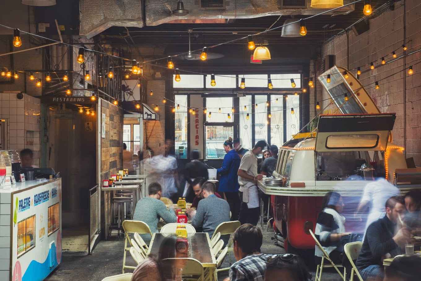 Tacos, quesadillas & more are dispensed from a VW van parked inside this kitschy garagelike space.