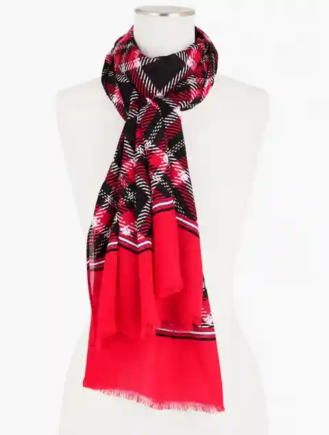A classic plaid print in the colorful shades you love. Light and versatile. Instant flair. Features Oblong Scarf Imported Fit: 27" X 72" Material: 100% Rayon Care: Machine Wash Cold; Only Non-Chlorine Bleach When Needed; Line Dry; Warm Iron With Steam If Needed | Nutcracker Plaid Oblong Scarf - Red ...more