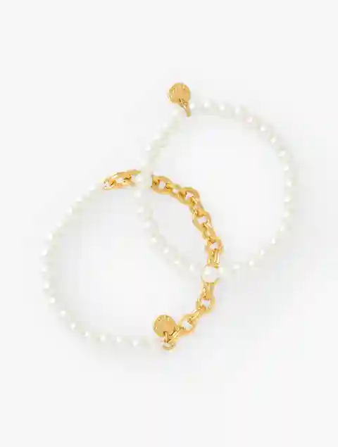 A touch of easy glamour. Our lustrous bracelets are strung on an easy on-off stretch band. Set of two features glossy pearls and polished chain links. Perfectly stackable. Features Stretch closure Imported Fit: 7 1/4" Material: 55% Glass, 35% Zinc, 4% Acrylic, 3% Thread, 2% Brass, 1% Cubic Zirconia ...more