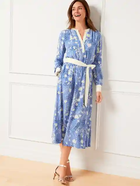 Belted Fit & Flare Shirtdress - Dancing Flowers - Capri Blue/Ivory - Small Talbots