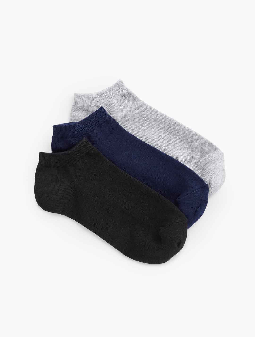 Three Pair Ankle Socks. Our comfortable socks. In a versatile ankle length. Pack of three. Features Imported Material: 67% Cotton 30% Polyester 3% Spandex Care: Machine Wash Cold, Gentle Cycle, Only Non-Chlorine Bleach When Needed; Tumble Dry Low | Three Pair Ankle Socks - Black/Ink/Grey - 001 Talbo...more