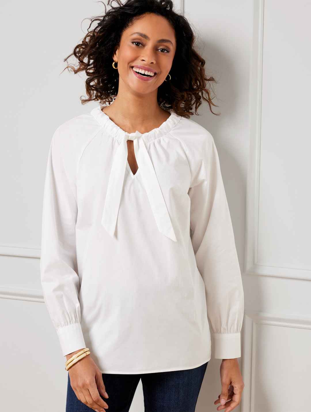 Misses - Tie Neck Poplin Top - White - XS - 100% Cotton Talbots