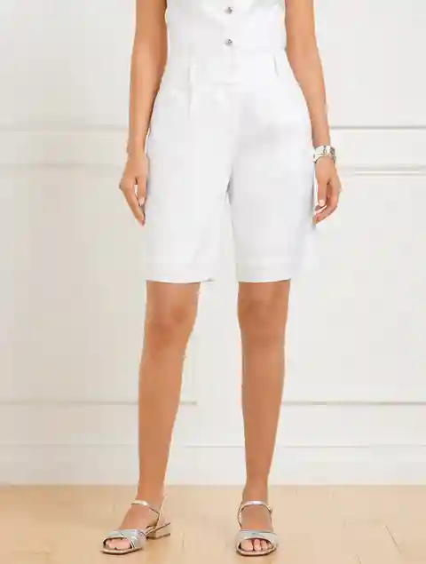 Our classic high waist shorts are elevated with crisp front pleats for an effortless look. Crafted from light and airy linen. Fully lined and perfectly tailored for effortless summer style. Features Hits High Waist Above Knee Length Fly front with hook & bar closure Front Slash, Back welt pockets Li...more