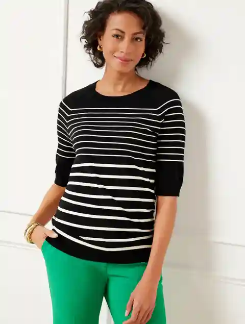 Endless versatility. Our easy pullover with short elbow-length sleeves in soft and light cotton blend. Perfect for transitional weather. Features Short Elbow Sleeve Hits At Hip Crew Neck Pullover Straight hem Imported Fit: Misses: 24"; Petite: 23"; Plus: 26 1/2"; Plus Petite: 25" Material: 56% Cotto...more