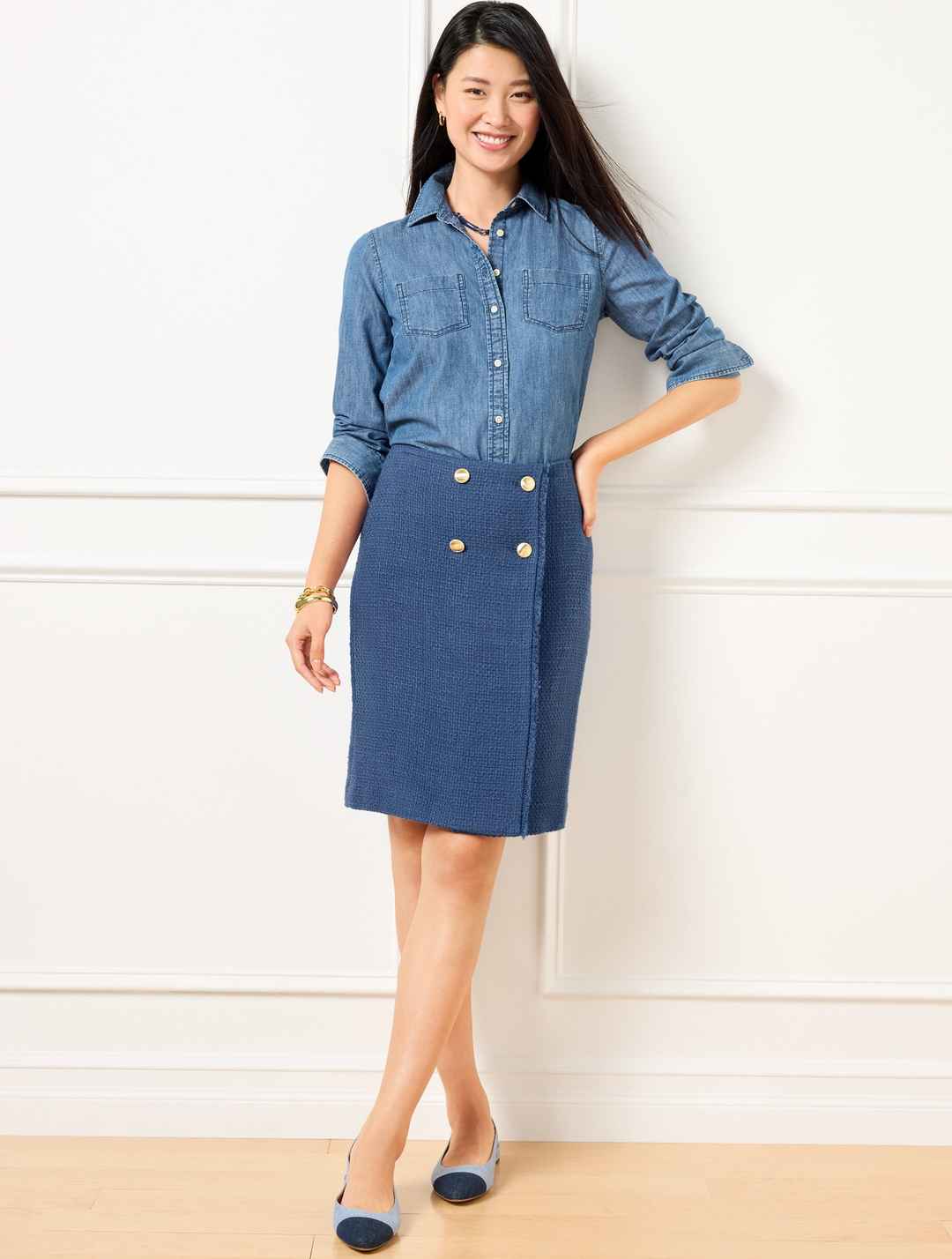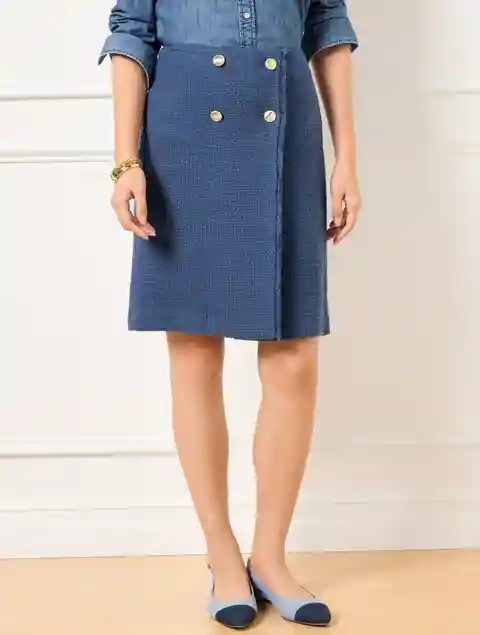 Textured tweed brings timeless sophistication to our favorite A-line skirt. Crafted with chic buttons at the front. The perfect balance of polished and playful. A desk-to-dinner favorite. Features A-Line Hits Above Knee Concealed side zip closure Lined Imported Fit: Misses: 20"; Petite:19" Material:...more