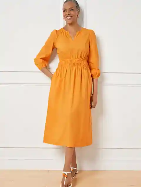 Petite - Smocked Poplin Midi Dress - Bright Marigold - 2 - 100% Cotton Talbots