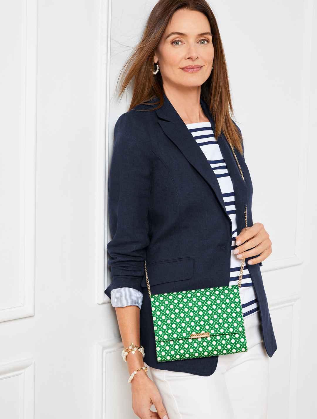 The perfect day-to-night accessory. Our gorgeous sateen clutch in an intricate dots print. With a sleek chain strap for versatile carrying options. Features Interior zip pocket Magnetic closure 22" strap Imported Fit: 8" L x 1" W x 6" H Material: 98% Cotton, 2% Spandex | Intricate Dots Sateen Clutch...more
