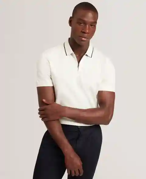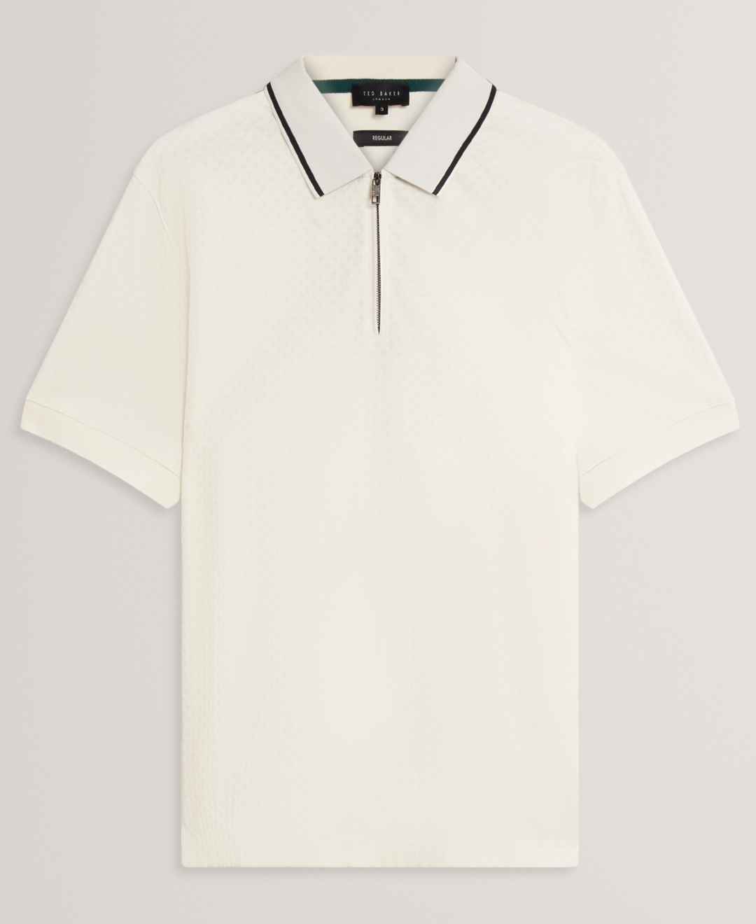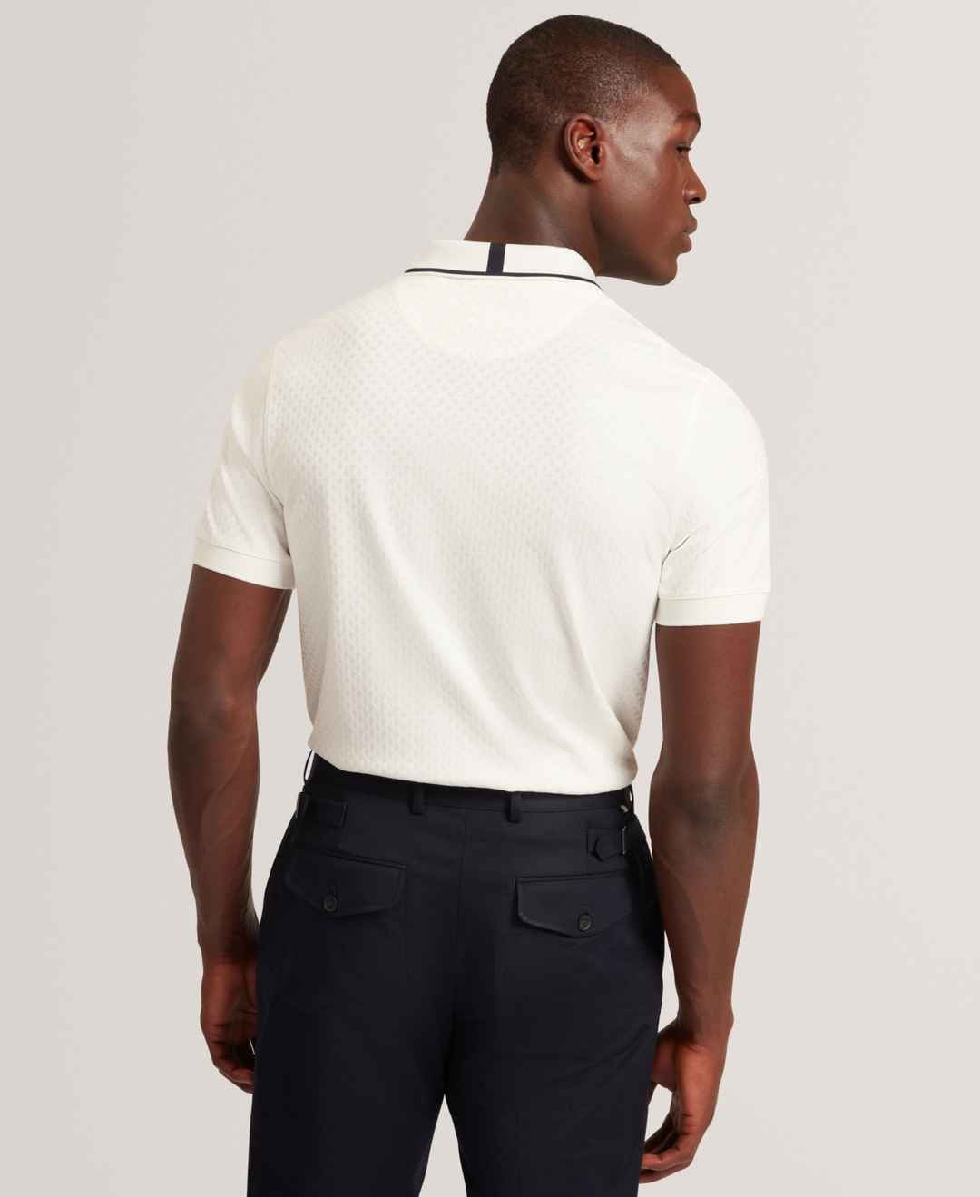 Highlighting a branded T-texture, this Ted Baker polo shirt is crafted with stretch for easy movement. The zipped neckline and stripe trim collar offer a modern twist on a classic design.