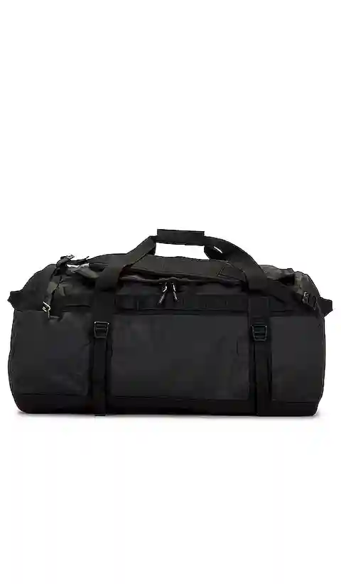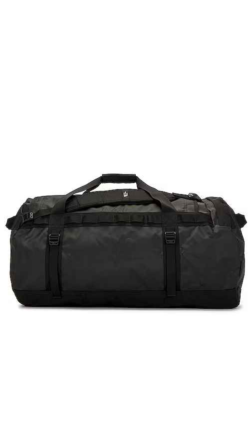 The North Face Base Camp Duffel-L in Black. The North Face Base Camp Duffel-L in Black. 100% polyester. Made in Cambodia. Two-way zip top closure. One main compartment. Internal mesh zip and slip pockets Four compression straps. Side compartment Mesh bag packaging included. Detachable and adjustable...more