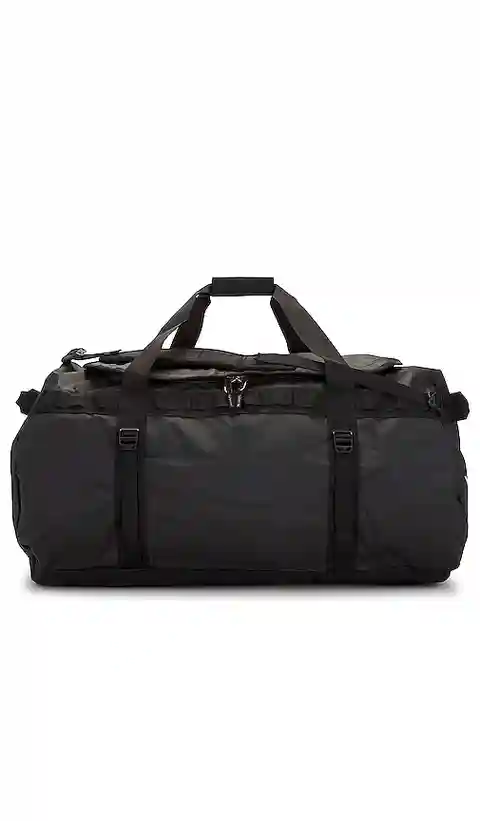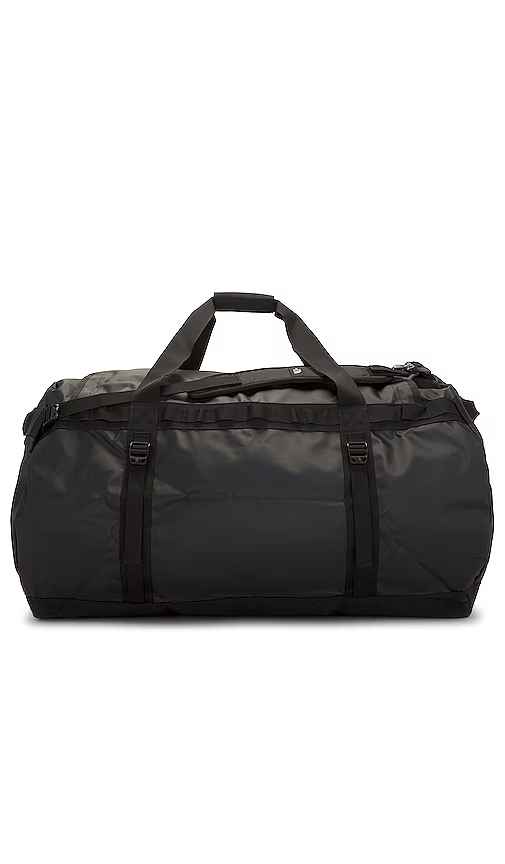 The North Face Base Camp Duffel-XL in Black. The North Face Base Camp Duffel-XL in Black. Polyester. Made in Cambodia. D-zip opening with weather-resistant flap. One main compartment with two mesh pockets. Water-resistant ID window on top. Two padded side handles Detachable and adjustable alpine-cut...more