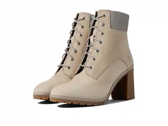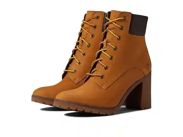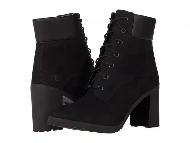 Stay stylish in comfort with the Timberland Allington 6 Lace-Up heel boots. Leather and textile upper. Lace-up closure. Round-toe silhouette. Textile lining and insole. Synthetic outsole. Stacked block heels. Imported. Measurements: Heel Height: 3 in Weight: 1 lb 1 oz Shaft: 6 1 2 in Product measure...more