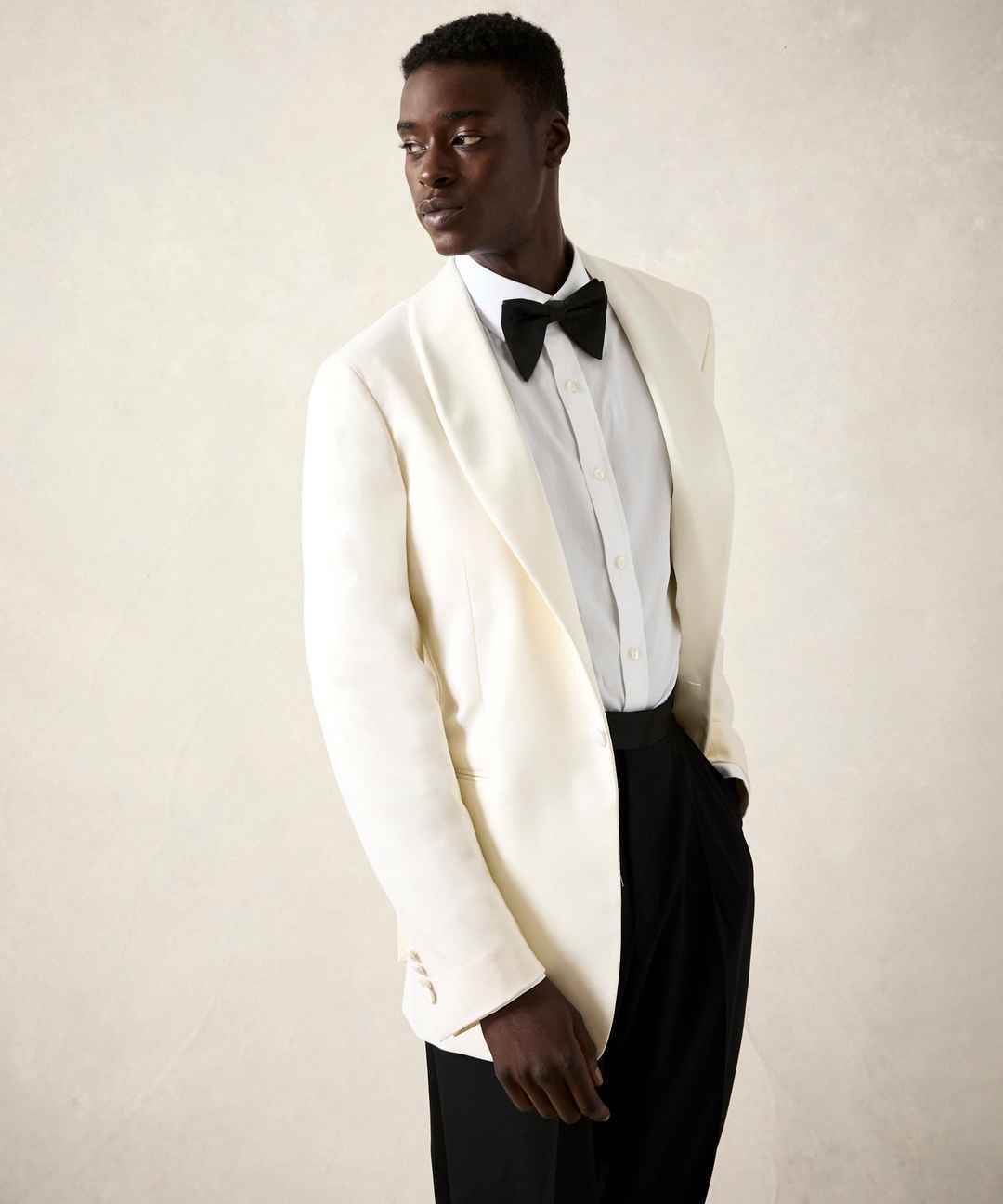 An essential for the sharp dresser, the fabric for our luxurious Ivory Shawl Collar Tuxedo Jacket is sourced from the renowned Tollegno Mill in Italy from a comfortable wool classic, not too hot, soft, and woven with a bit of stretch for comfort. It's a chic update on everything you love about the ...more