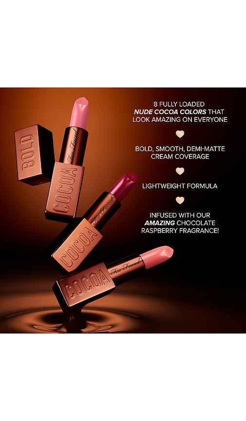 Too Faced Cocoa Bold Lipstick in Buttercream. Too Faced Cocoa Bold Lipstick in Buttercream. Ditch those basic, boring nudes and indulge in Too Faced's ultra-decadent, chocolate-scented rich & creamy Cocoa Bold Cream Lipstick!. In Buttercream - warm apricot nude. Paraben and cruelty-free. Designed to...more