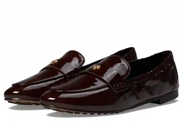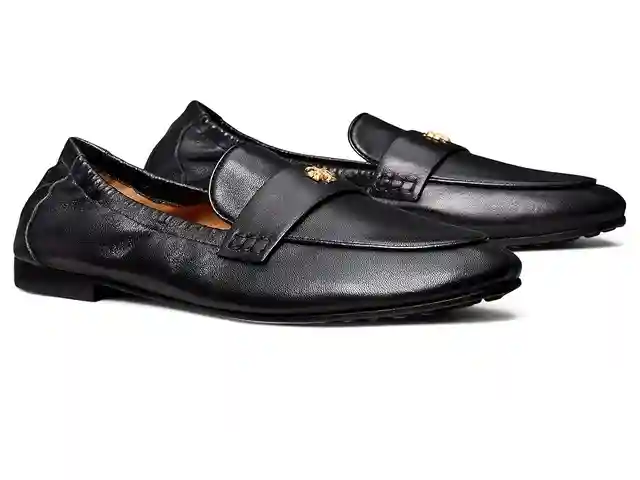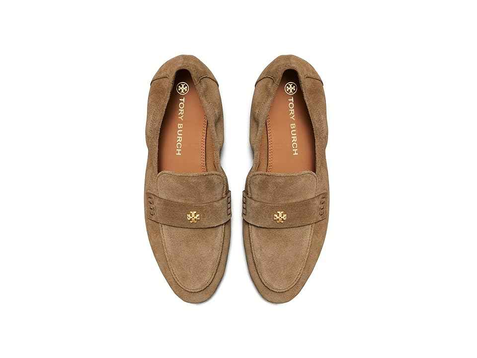 Enjoy the comfort of ballet footwear with the appealing looks of loafers wearing the Tory Burch Ballet Loafers. Suede upper. Sheep leather lining. Cushioned insole. Brushed gold double T detail. Hand-painted edges and stitches. Ruched sides offer easy movement. Almond toe. Slip-on style. Leather and...more
