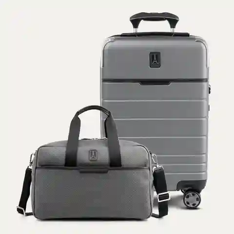 Travelpro x Travel + Leisure Carry-On Spinner & Underseat Tote Bag Luggage Set in Whistler Grey | Hands-Free Mobility | Travel Suitcase