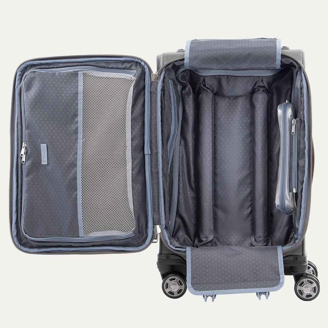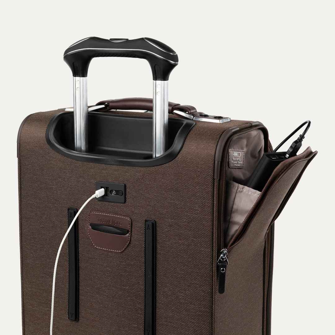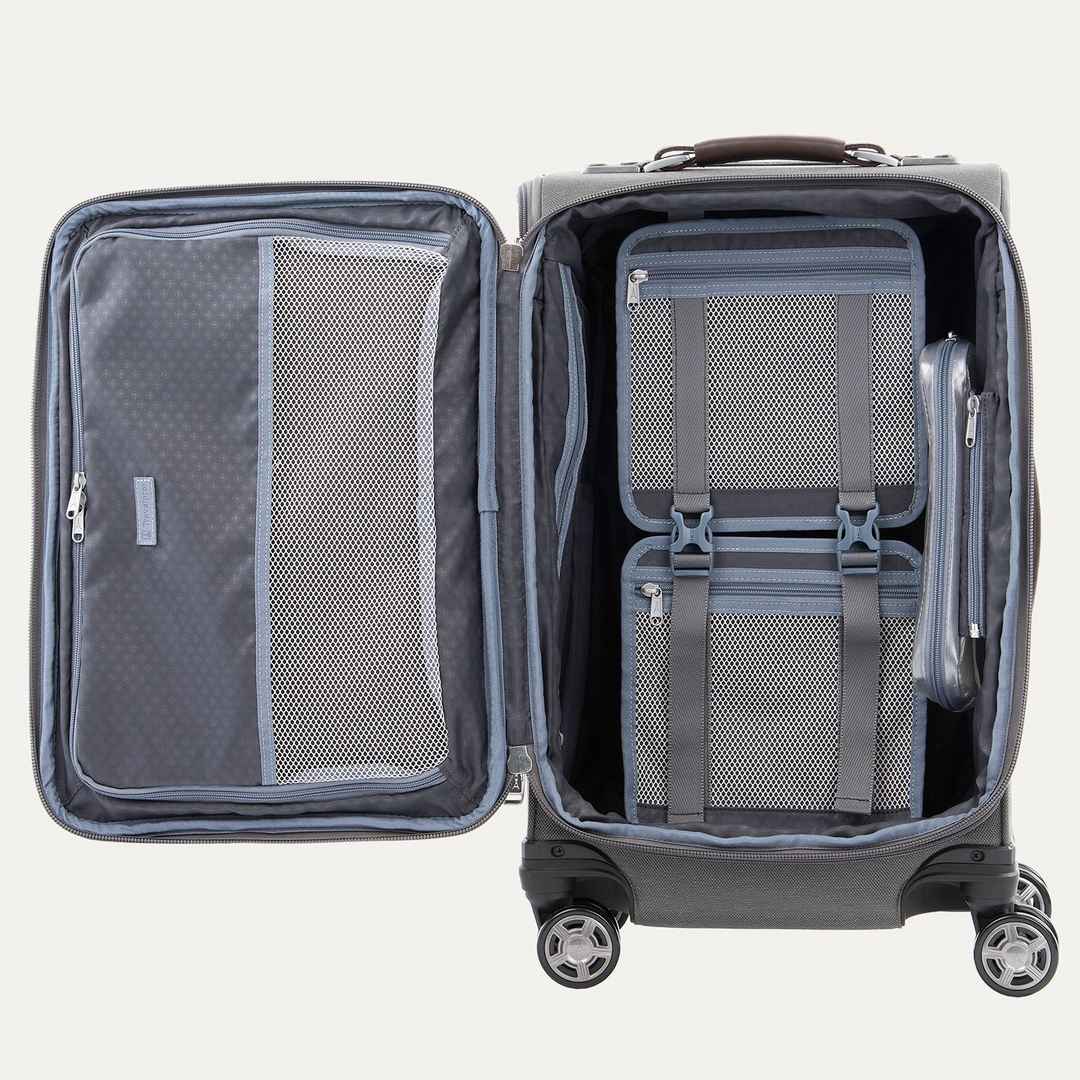 Travelpro Platinum Elite lets you maximize your carry-on in sophisticated style, featuring premium fabrics, genuine leather, chrome zippers, and a tip-resistant expansion that offers up to 2 more packing capacity With its integrated USB A & C ports, this Expandable Carry-On Spinner gives you the pow...more