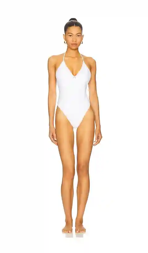Tularosa Kacia One Piece in White. - size L (also in M, S, XL, XS, XXS) Tularosa Kacia One Piece in White. - size L (also in M, S, XL, XS, XXS) Self: 82% nylon 18% elastane Lining: 93% polyester 7% elastane. Hand wash. Halterneck tie-up closure. Rosette accent at bust. Open back. TULA-WX1466. TRX100...more