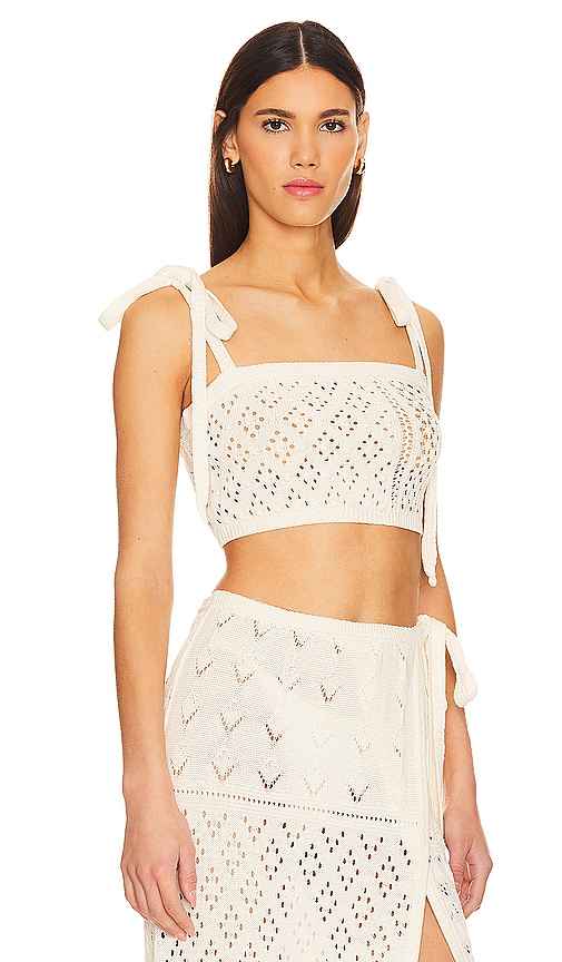 Tularosa Thea Top in Ivory. - size M (also in S, XL, XS, XXS) Tularosa Thea Top in Ivory. - size M (also in S, XL, XS, XXS) 100% cotton. Made in China. Dry clean only. Adjustable shoulder ties. Open knit fabric. Item not sold as a set. TULA-WS1018. TRK581 S24. Tularosa, the new LA-based label, is a ...more