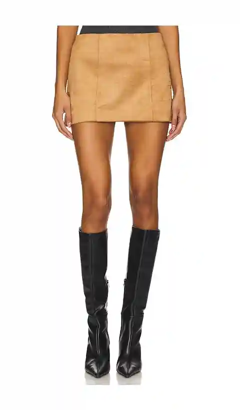 Tularosa Ginny Faux Suede Mini Skirt in Tan. - size L (also in M, S) Tularosa Ginny Faux Suede Mini Skirt in Tan. - size L (also in M, S) Self: 90% polyester 10% elastane Lining: 97% polyester 3% elastane. Made in China. Hand wash. Fully lined. Hidden back zipper closure. Faux suede fabric. Skirt me...more