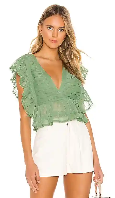 Tularosa Kaia Top in Green. - size S (also in XS) Tularosa Kaia Top in Green. - size S (also in XS) Self & Lining: 100% poly. Hand wash cold. Surplice front with semi-sheer bottom hem. Lace and ruffle trim throughout. Adjustable back tie closure. Side button closure with keyhole loops. Imported. TUL...more