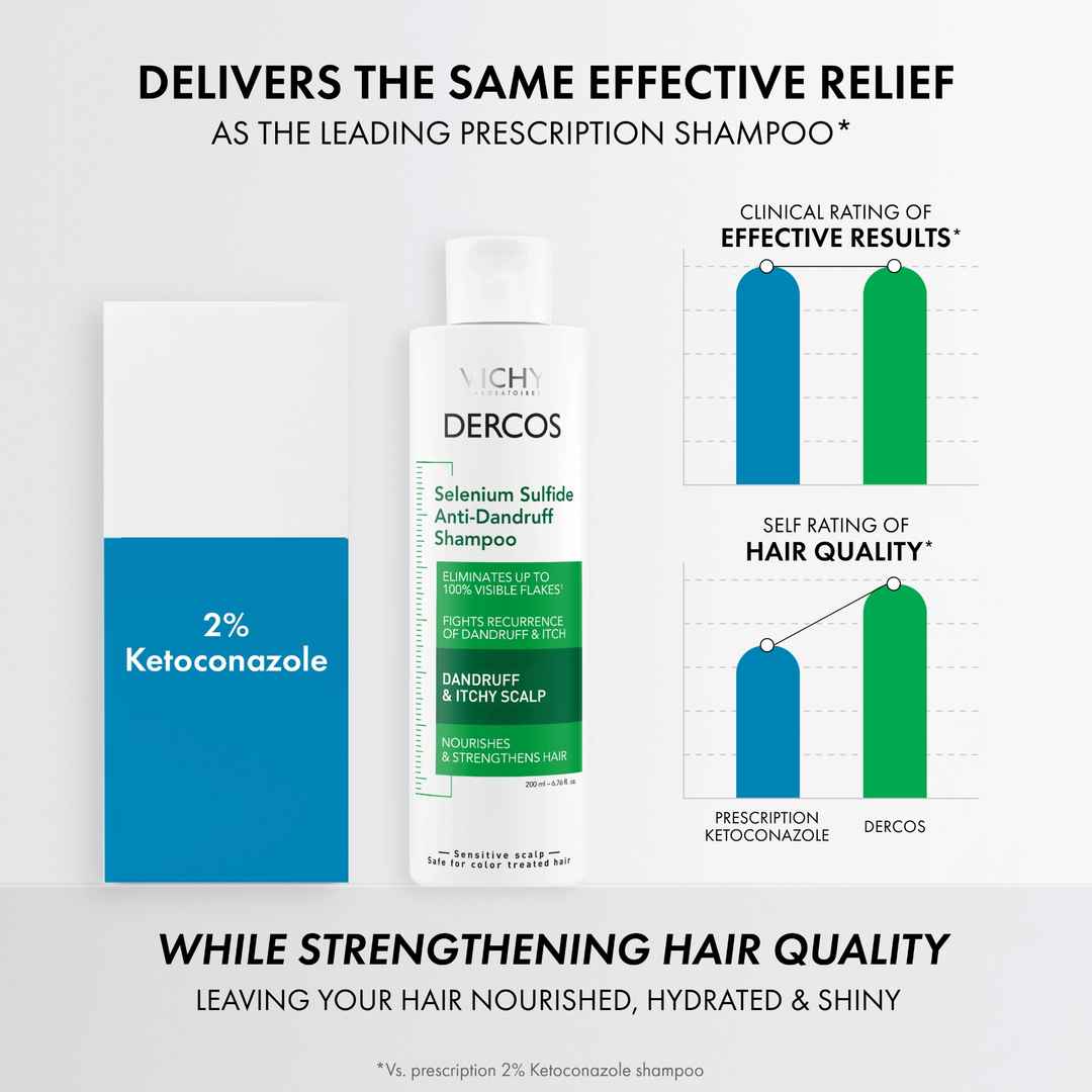 Dercos Selenium Sulfide Anti-Dandruff Shampoo delivers highly effective relief from dandruff & itch, eliminating up to 100% of visible flakes and preventing the recurrence of dandruff & itch.Our shampoo is formulated with 0.6% Micronized Selenium Sulfide to fight dandruff at the source and act on th...more