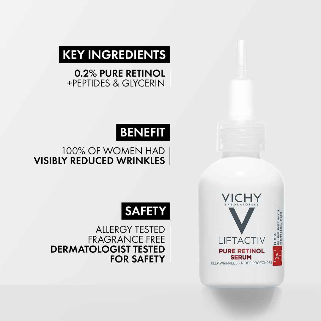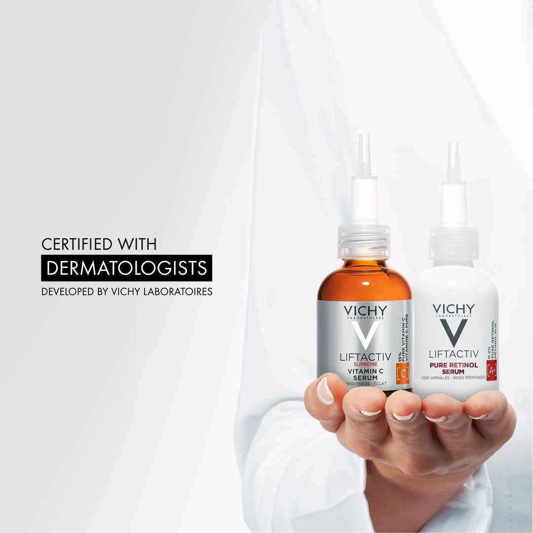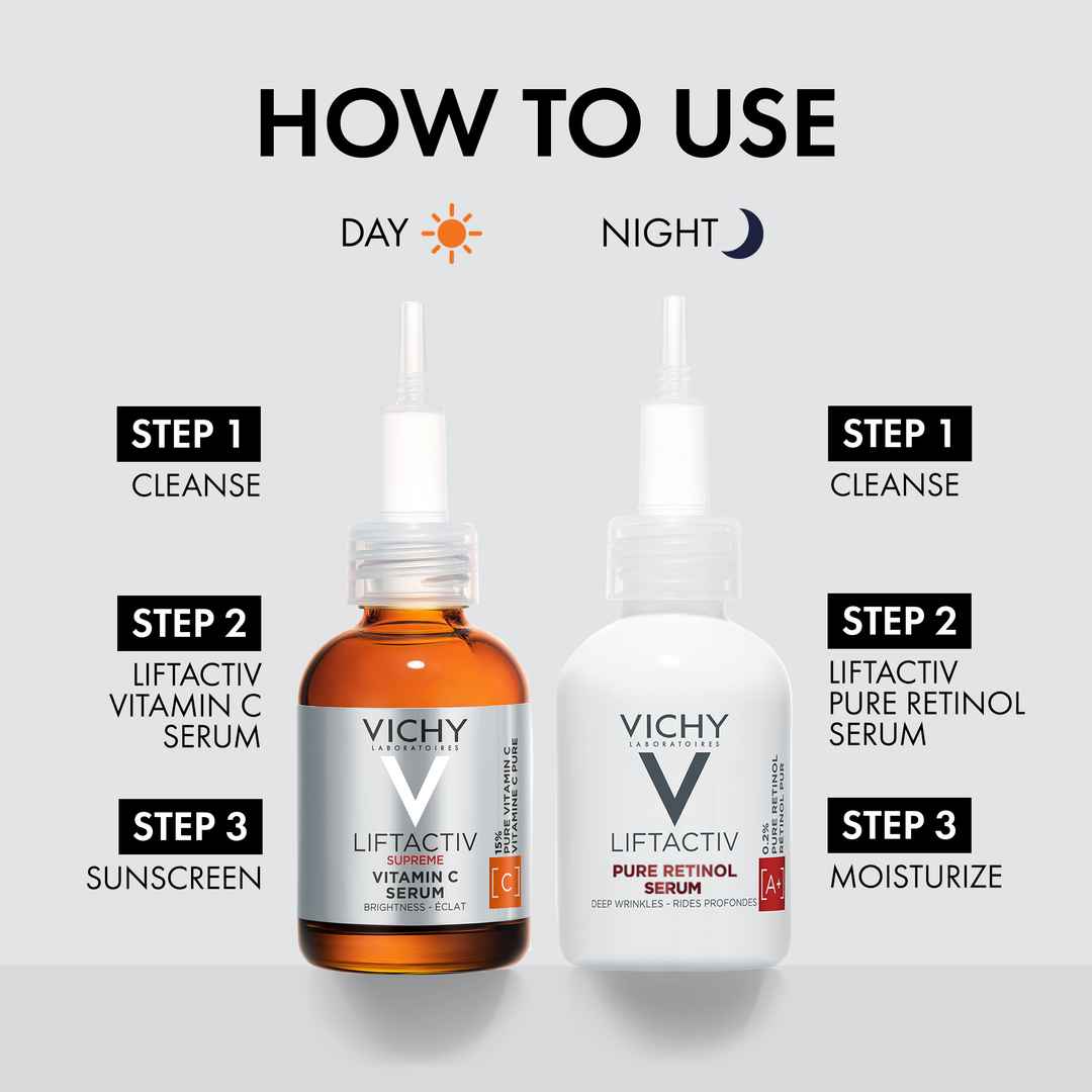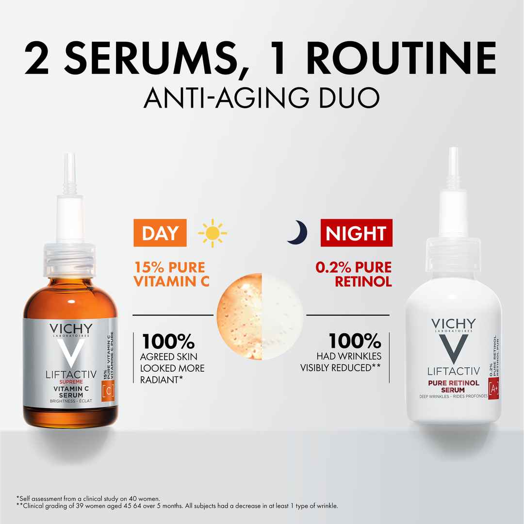 2 Serums, 1 Routine: Discover the power of Vitamin C and Retinol. Featuring:In the morning:After cleansing, apply 3-5 drops of LiftActiv Vitamin C Serum over a dry face and neck. Clinically proven results to protect skin from the discoloration caused by pollution. 100% of women agreed skin looked mo...more