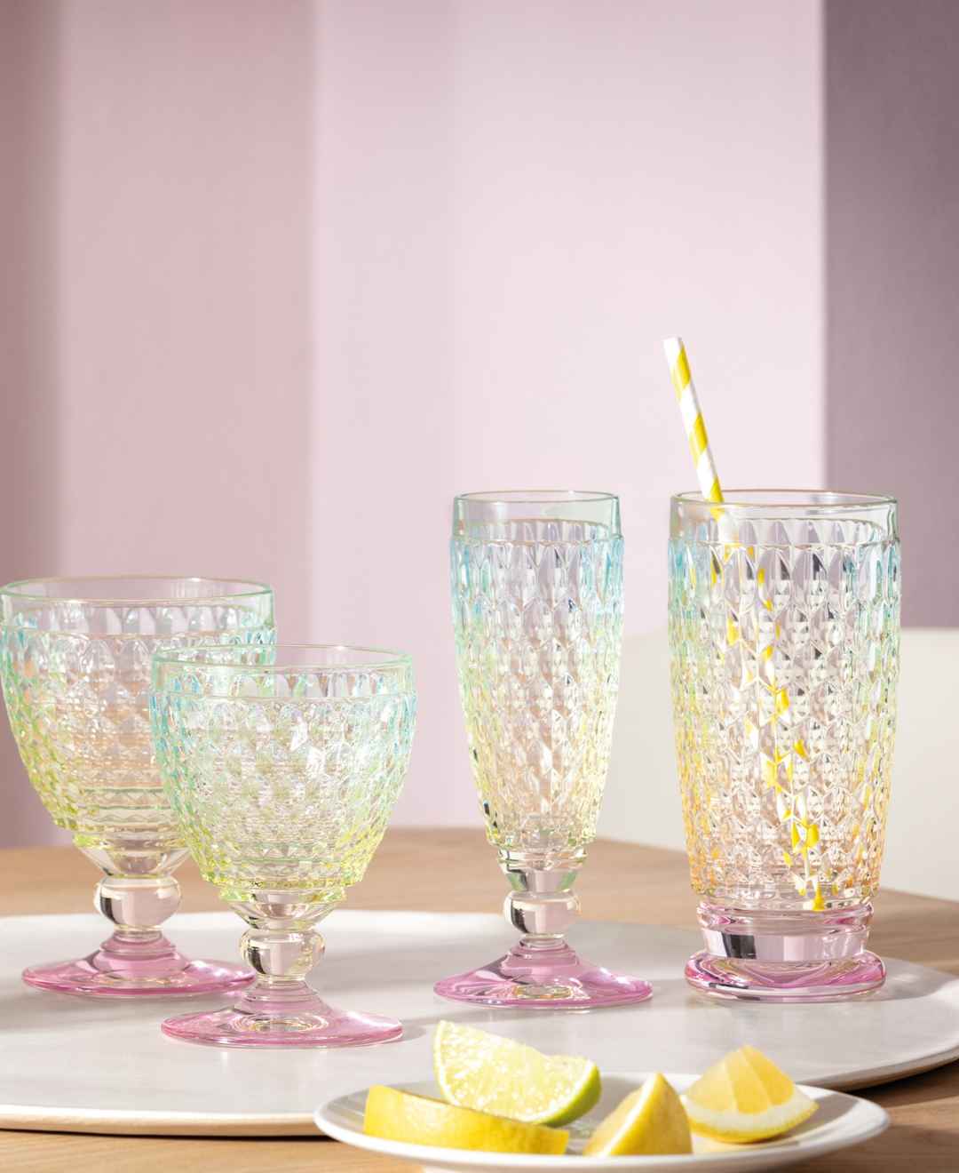 Classic Boston lead free crystal by Villeroy and Boch have traditional diamond facets that reflect and refract light. Add a colorful accent to your table with this stunning crystal collection.