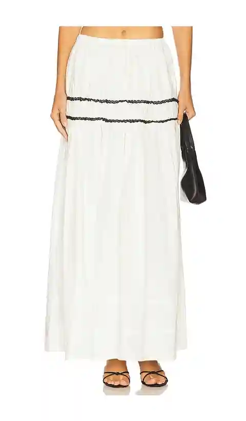 WeWoreWhat Tiered Midi Skirt in White. - size L (also in M, S, XS) WeWoreWhat Tiered Midi Skirt in White. - size L (also in M, S, XS) 97% cotton 3% spandex. Machine wash. Unlined. Pull-on styling with elastic waistband. Striped accents. Midweight poplin fabric. Skirt measures approx 40 in length. WW...more