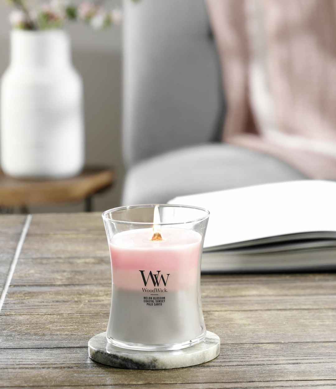 Our fragrance curators have layered the scents of Melon Blossom, Coastal Sunset, and Palo Santo to envision a coastal getaway. Fragrance layers, top to bottom: Melon Blossom: A sun-drenched combination of juicy melon, cucumber, and baobab traced with violet leaf and lemon blossom; Coastal Sunset: Su...more