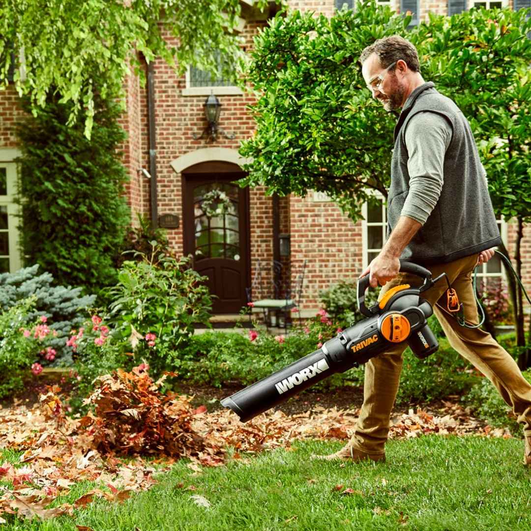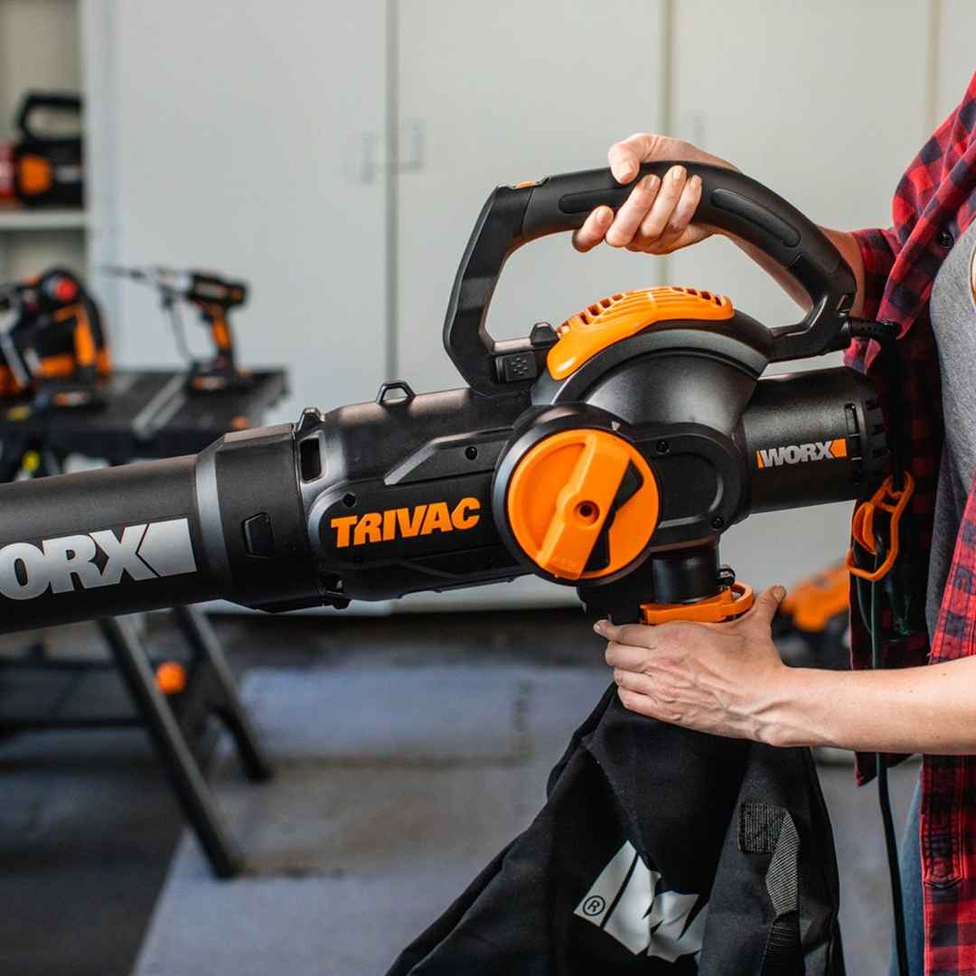 The WORX TRIVAC is the easy-to-use, All-in-one system for blowing, vacuuming, and mulching leaves. No stopping to change tubes and no downtime to switch from a blower to a vac. This machine does it all with a flip of a switch and no tools. TRIVAC 12-Amp Electric 3-IN-1 Blower / Mulcher / Yard Vacuum...more