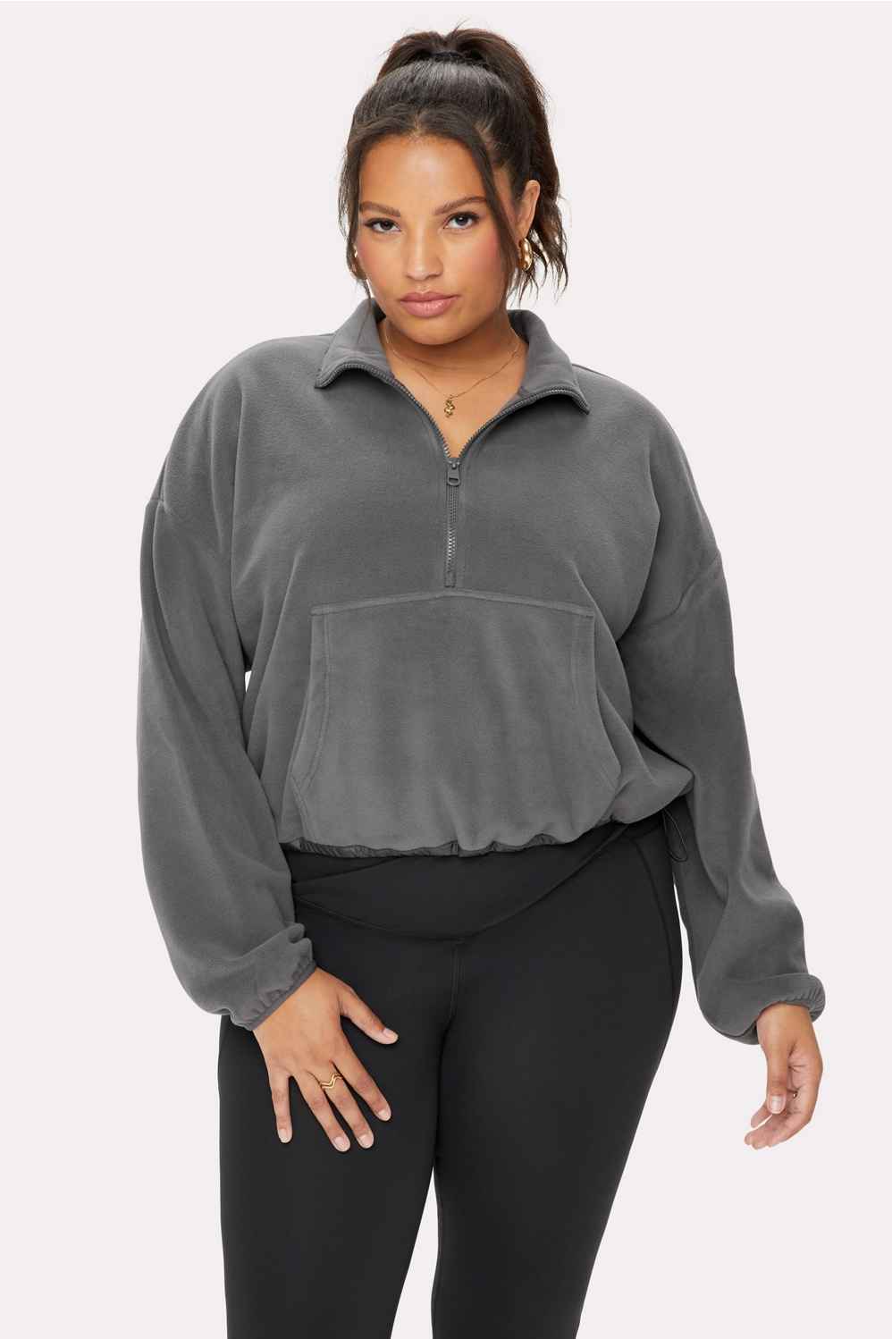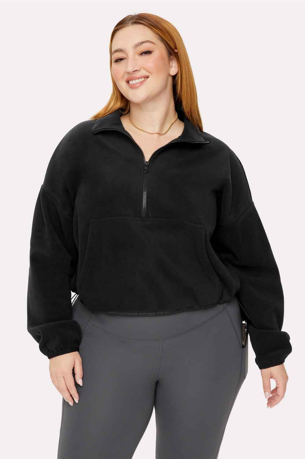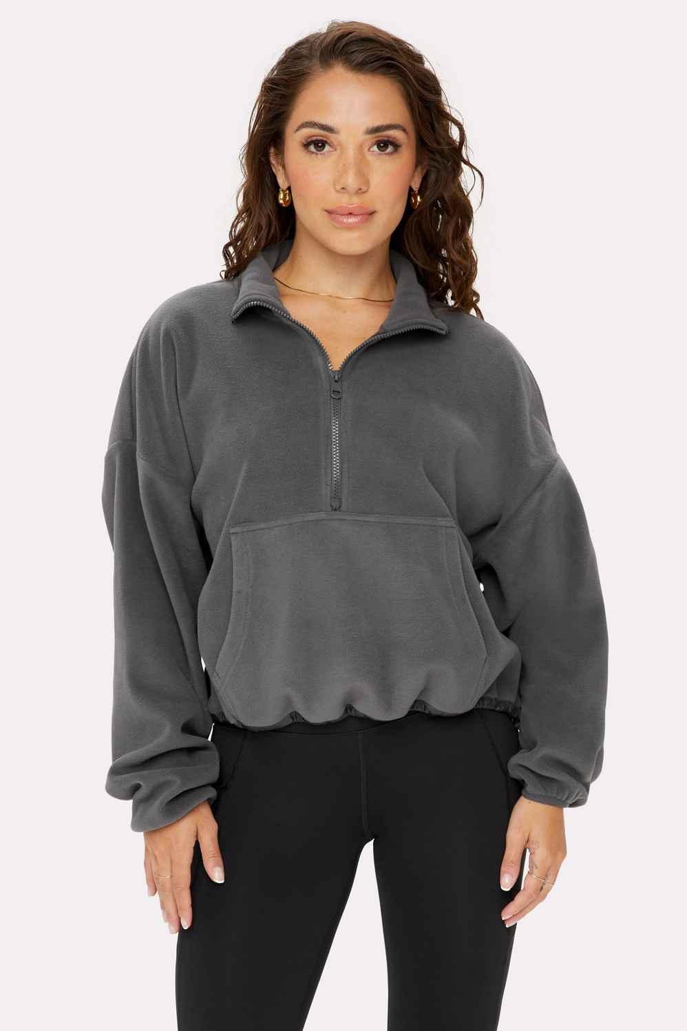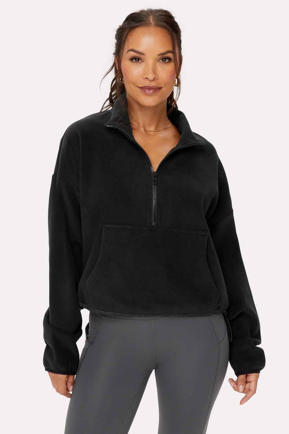 A throw-on-and-go staple for crisp days ahead. Made with ultra-soft, hand-brushed fabric, featuring a half-zip for easy wear and a roomy front pocket to keep your hands toasty. Slightly cropped with a bungee at the waist for an adjustable fit.