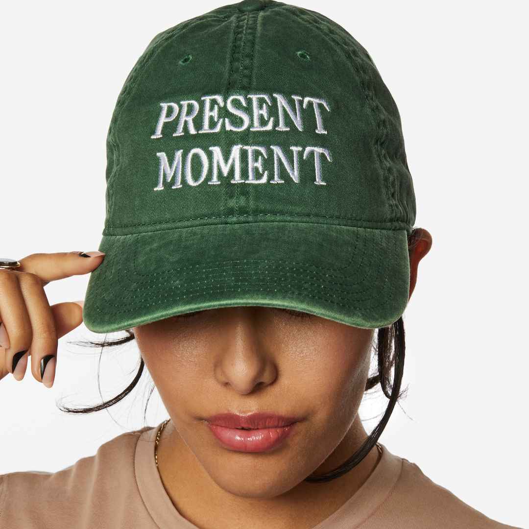 This baseball cap bears the powerful words "Present Moment" embroidered on the front. This artwork serves as a constant reminder to stay present, embracing the beauty and significance of the current moment. On the back you'll find the words, "All That Matters Is Right Now" thoughtfully embroidered, ...more