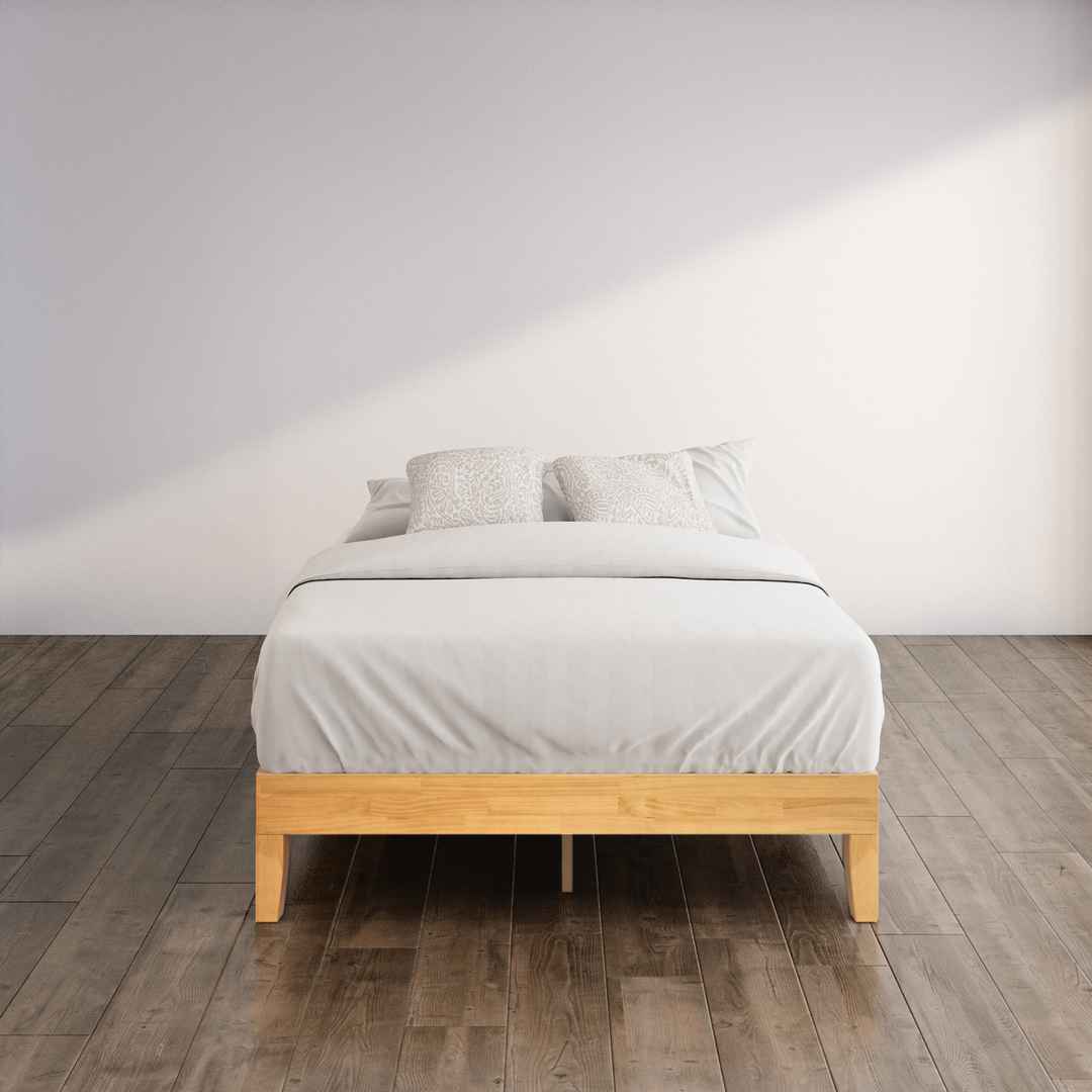 With solid structure and simplicity at its best, the Moiz Deluxe Wood Platform Bed Frame fuses traditional style with rustic charm. This solid wood frame, with its beautiful natural finish, is engineered with wood slats for mattress support with no box spring. This sturdy, attractive, and easy-to-as...more